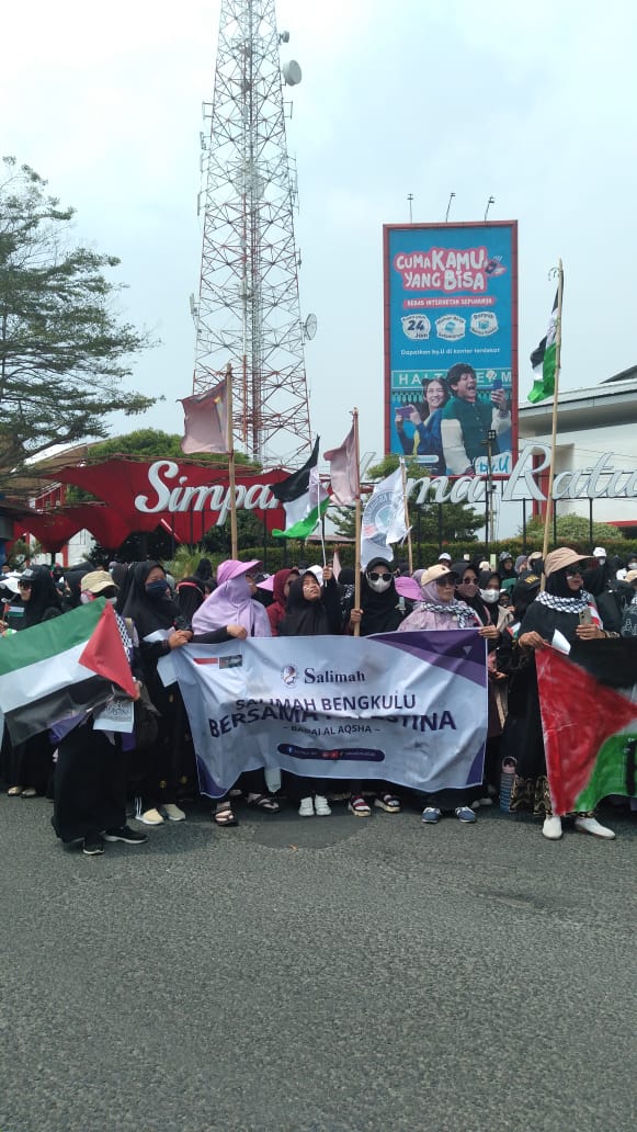 Bengkulu (15/10) – Pengurus PW Salimah Bengkulu hadir bersama ratusan massa aksi yang berasal dari berbagai ormas Islam dan masyarakat umum Kota Bengkulu yang diberi nama BADAI (Bengkulu Aksi Damai) Untuk Al Aqsha. Aksi tersebut sebagai bentuk dukungan untuk bangsa Palestina yang saat ini sedang bertempur menghadapi penjajah Zionis Israel.