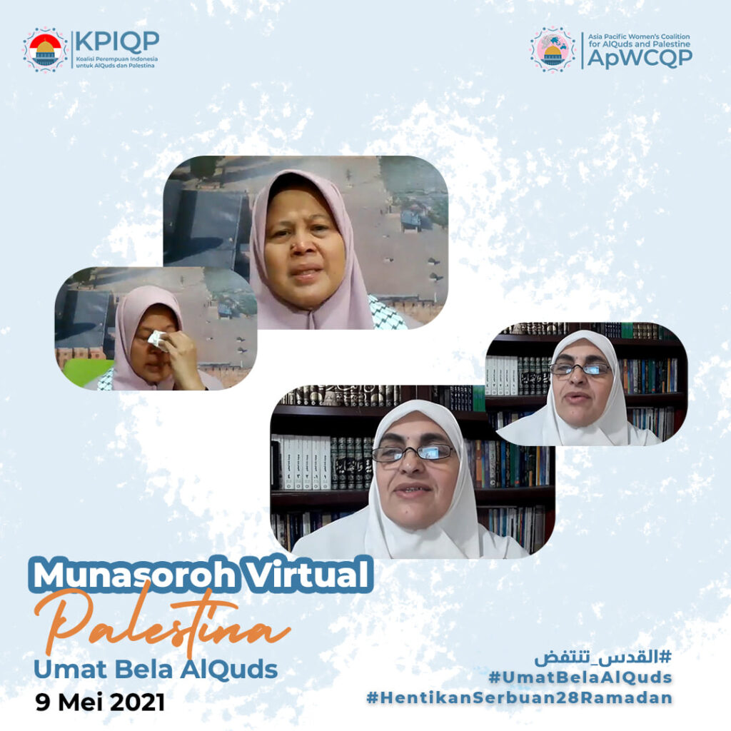 Jakarta (9/5) – Minggu, 9 Mei 2021 atau bertepatan dengan 27 Ramadhan 1442 H, Koalisi Perempuan Indonesia untuk Al Quds dan Palestina (KPIQP) menggelar acara Munasoroh Palestina sebagai bentuk dukungan